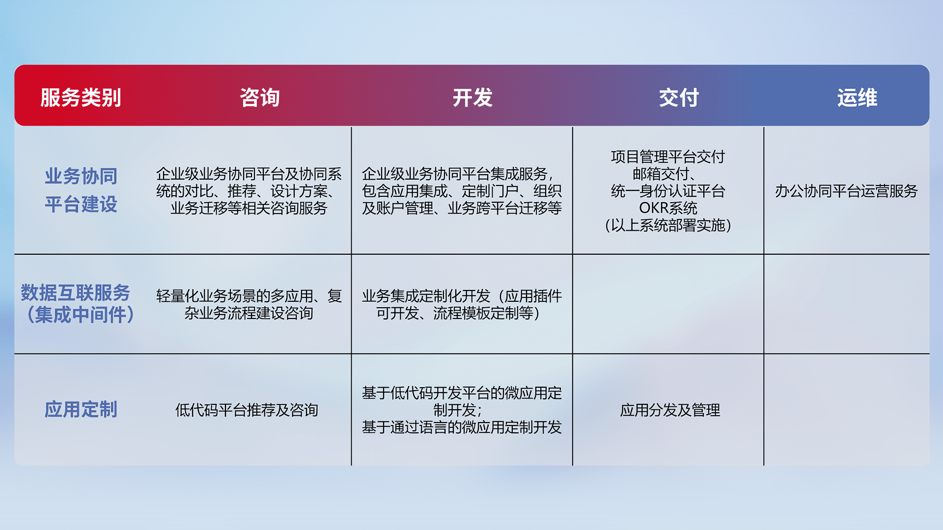 针对钉钉、、、企微、、IDaas等平台级产品提供产品的规划、、、、方案、、交付、、定制化开发等服务,,实现如统一协同办公、、智能客户服务、、、、混合会议管理、、、、智能数据查询、、、等业务场景,,,实现数字化转型。。。